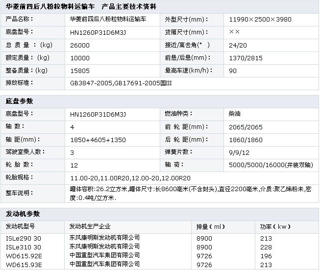 華菱前四后八粉粒物料運(yùn)輸車  底盤(pán)型號(hào):HN1260P31D6M3J 額定質(zhì)量:10000