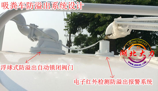 吸糞車滿罐反溢出罐體的現象非常嚴重,溢出贓物直接污染油水分離器和二級分離器,最嚴重的,雜物進入真空泵,毀壞葉輪和刮片。全新的浮球式防溢出自動鎖閉閥門,將會在液面高于限定位置時,自動鎖閉,并在排除多余真空壓力,有效的保護管網和過濾系統,確保真空行程安全運行。再配合新加裝的電子紅外檢測防溢出報警系統,當液面高于限定容積時,車輛將自動報警,提醒操作人員排壓限速,雙重的保障下,讓吸糞車更加安全和人性化。